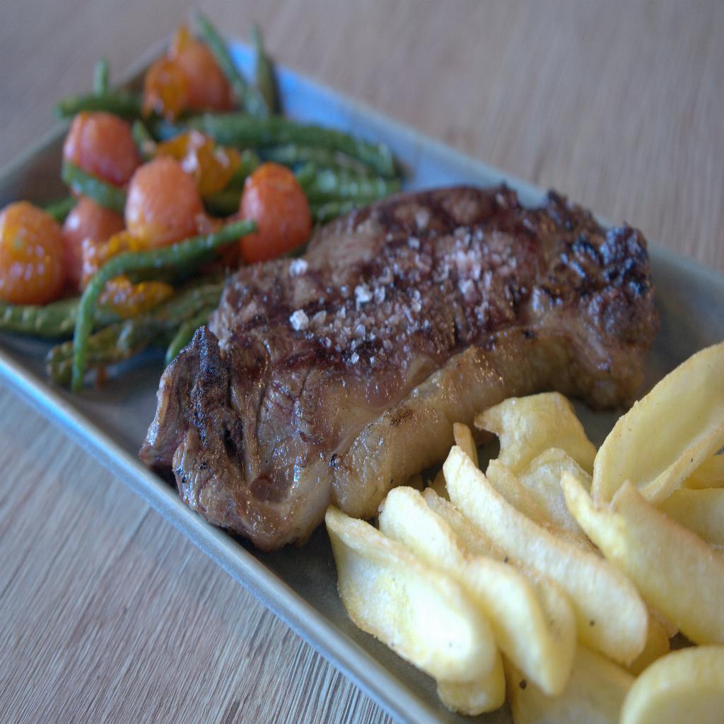 Al más puro estilo americano: Entrecot de vaca madurado a la parrilla. Acompañado de judías bobby, tomates cherry y patatas fritas.