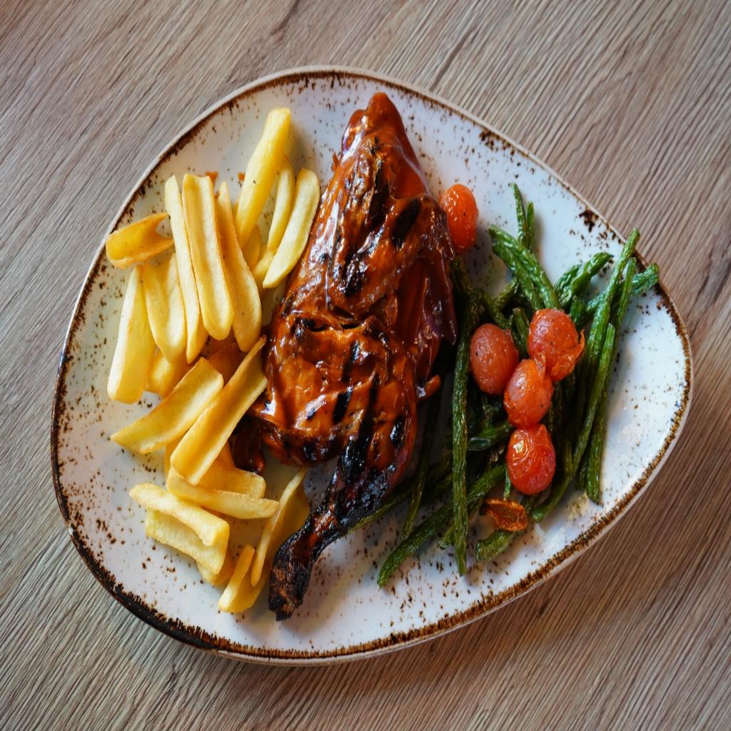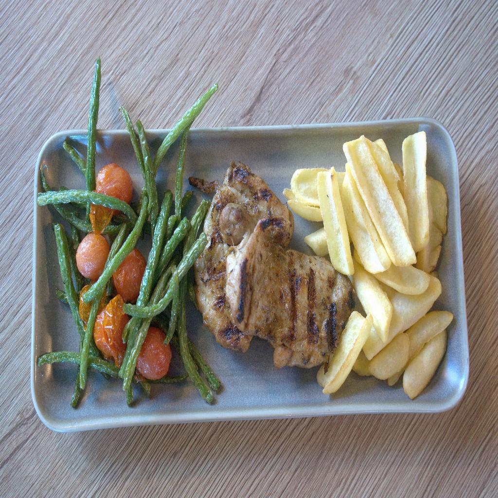 El único pollo que te vamos a montar. Pollo jugoso a la parrilla con nuestro marinado casero de 10 especias. Acompañado de judías bobby, tomates cherry y patatas fritas.